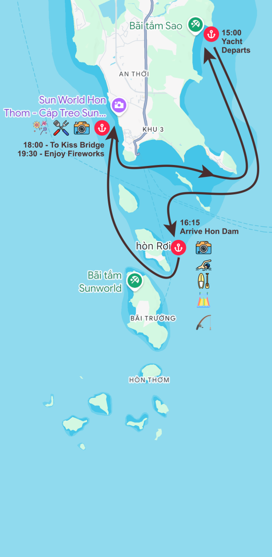 El final del tour tiene lugar cerca del icónico Puente del Beso (Cầu Hôn), uno de los lugares más emblemáticos de Phu Quoc. Al caer la noche, los visitantes disfrutan de un espectacular espectáculo de fuegos artificiales que ilumina el cielo sobre el mar. Ver los fuegos artificiales desde la cubierta de un catamarán añade una sensación de exclusividad y magia, haciendo la experiencia verdaderamente inolvidable.